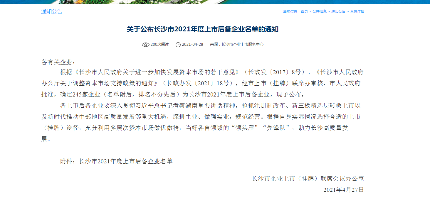 根據《長沙市人民政府關于進一步加快發展資本市場的若干意見》(長政發〔2017〕8號)、《長沙市人民政府辦公廳關于調整資本市場支持政策的通知》(長政辦發〔2021〕18號),經市上市(掛牌)聯席辦審核,市人民政府批準,確定245家企業為長沙市2021年度上市后備企業,其中湖南人健寶固高新科技發展有限公司是2021年度上市后備企業中的一員。